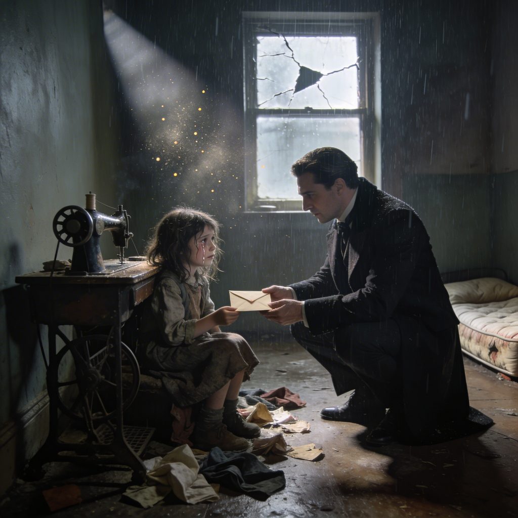 A ray of sunlight cut through a cracked window, illuminating an old wooden table. Sitting there was a little girl, no older than nine or ten, hunched over a worn sewing machine. Her hair was tangled, her face smudged. A strip of fabric wrapped around her wrist was darkened with dried blood. With each press of the pedal, the machine echoed through the room.