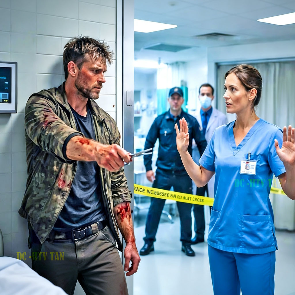 The room froze. The patient backed into the corner, the shears held in a reverse grip, blade running along the forearm—a knife fighter’s stance. His chest was heaving, blood soaking through the shredded remains of his gray T-shirt.