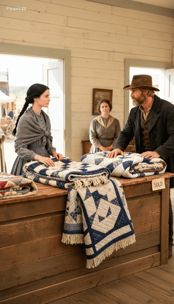 They belonged to nights when warmth had mattered before morning arrived. She brought two finished quilts to town the following week because the women who had spoken at the supply stop had already left cloth deposits at her cabin door. old wool skirts, coat lining, even one unused blanket cut carefully into strips where she had marked the strongest sections.