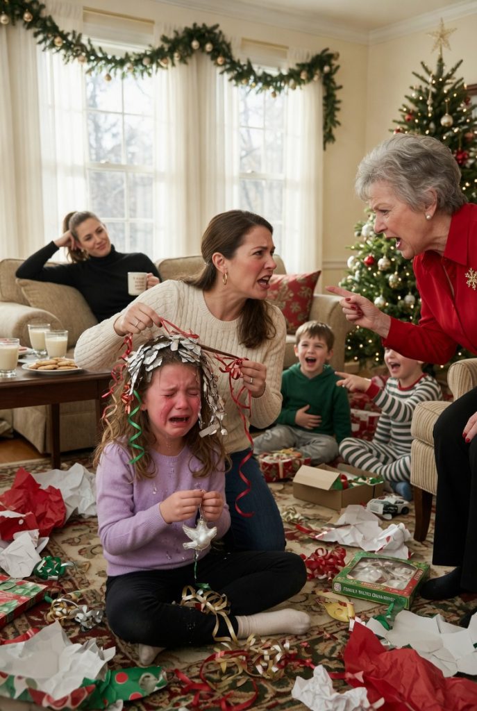 Before I could respond, Mom bent down toward Maya, gathering a handful of shiny torn wrapping paper from the floor. Her movements were almost playful—almost. “Here,” she said, voice dripping with false sweetness. “You want presents, don’t you? Let’s wrap you up instead.”