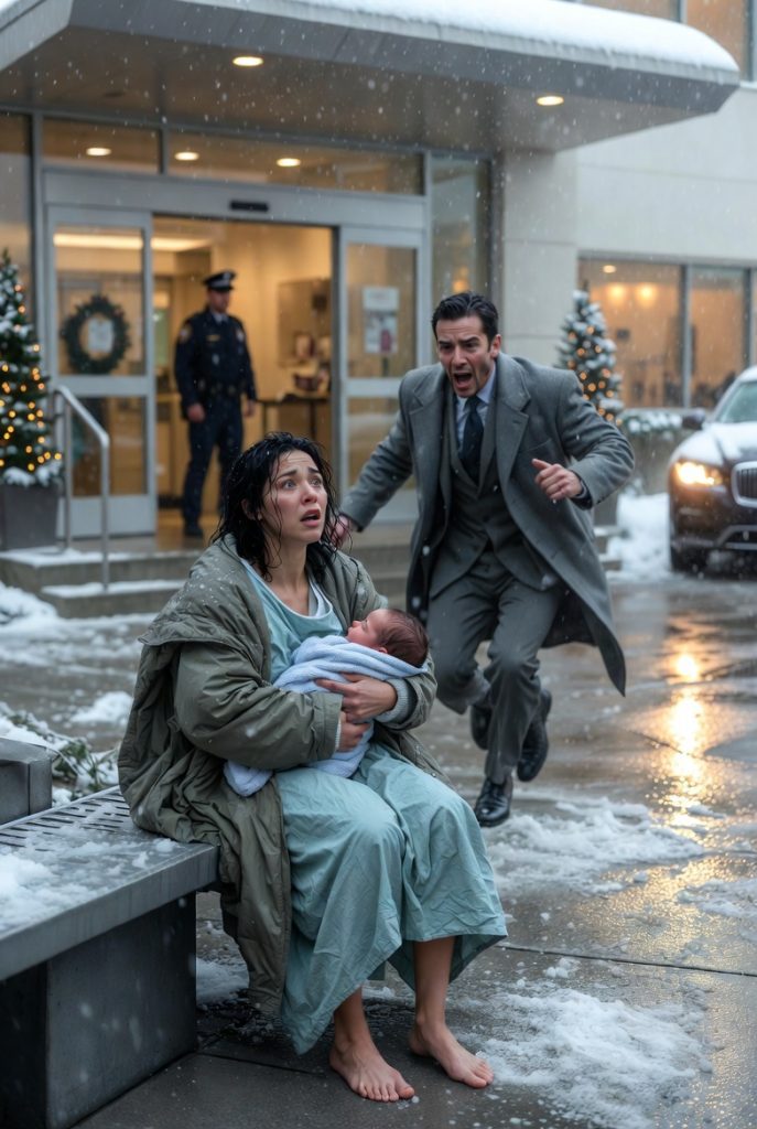 A young woman in a hospital gown. An oversized coat draped over her shoulders—someone else’s, clearly given in haste. Bare feet on the icy concrete. Her whole body trembling violently as she clutched a bundle to her chest.