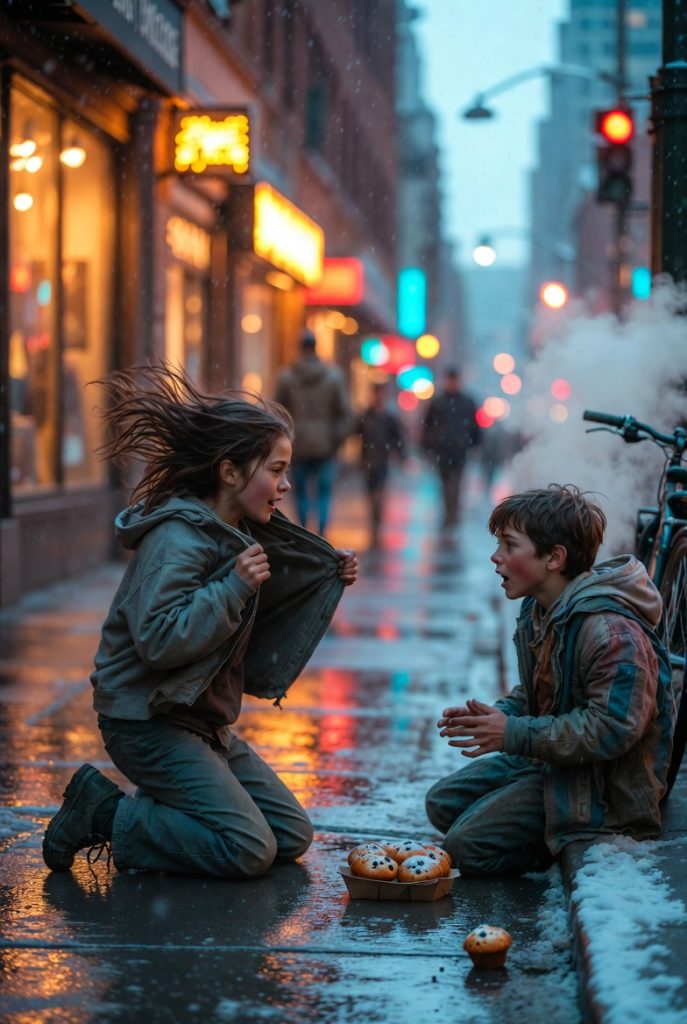 The December wind in Seattle did not simply sting; it sliced through sidewalks and skin like invisible wire, carrying the metallic scent of rain and cold asphalt, while the city rushed forward as if it didn’t notice winter at all. Twelve-year-old Nora Lane, with her scuffed red sneakers and secondhand yellow backpack, walked faster than the wind itself, gripping a small cardboard tray of homemade blueberry muffins tied with mismatched string. Every muffin she sold bought milk, heating, and one more month where eviction didn’t feel like a shadow breathing at their door. Her mother, Renee, cleaned office buildings when the city slept and came home smelling like bleach and exhaustion, but she still kissed Nora’s forehead every morning and told her that kindness was the only form of wealth nobody could take away.Nora wasn’t like the kids who complained about internet speed or cried when a phone cracked; she carried a sort of quiet awareness, a sensitivity sharpened not by luxury but by survival, and because life had taught her that pain did not always scream — sometimes it sat silently in the corner of a cold street and waited to be seen.That was when she saw him.He was sitting near the entrance of a busy shopping district, knees pulled tight against his chest, tiny shoulders shaking, thin dark hair plastered against his forehead from melting frost. His jacket, clearly expensive once, hung loosely on his frame now, as if the warmth that should have filled it had long since abandoned him. People passed by — some glanced, some frowned in irritation as if his existence inconvenienced them, many pretended their headphones made them deaf, and some kids pointed before being pulled away by impatient parents. Humanity was everywhere, yet compassion seemed nowhere close.But Nora’s feet stopped.She leaned her bike against a railing and approached the boy with the kind of hesitant bravery that only belongs to children who have been hurt but still believe in gentle worlds. “Hey… hey, are you okay?” she whispered, kneeling so she wouldn’t tower over him.For a second he didn’t speak, as if words had frozen somewhere between his heart and lips. Then his tiny voice broke free in jagged pieces.“I ran away… my uncle yelled, and my dad didn’t listen… nobody ever listens… they just tell me to be tough.”There was something devastating in the way he said tough — like a word too heavy for small lungs.Nora swallowed. She didn’t know his story and she didn’t have money or power or even a stable life to offer, but she understood loneliness; she knew how it felt when the world refused to look back at you. So she did the most natural thing her heart instructed — she shrugged off her worn-out hoodie even though the air bit her arms instantly, wrapped it gently around his shaking body, and gave him the warmest smile she could sew together.“It’s not much,” she breathed, “but it’s warm — and I think warm is all we both need right now.”The boy looked at her with disbelief, as if kindness itself was a magic trick he had never witnessed. “Why are you helping me?” he asked.“Because pretending not to see you hurts more than the cold,” Nora replied softly.She helped him stand, guided him toward the local shelter she knew existed not because she’d volunteered there, but because on nights when poverty felt too loud, she had sat outside it with her mother waiting for canned soup distributions. They gave him a blanket. She gave him a muffin. He ate slowly, like each bite was precious.Meanwhile, across the city, Alexander Reed, a billionaire tech mogul known for his stone-cold interviews and famously emotionless demeanor, was spiraling into panic. His only child, Leo Reed, had vanished after an argument with Alexander’s sister, Monica, who believed firmness equaled love. Since the tragic accident that took Leo’s mother, grief had iced Alexander’s soul. He replaced emotion with meetings, love with strategy, presence with payment. Now his empire, his wealth, his control — none of it mattered.When his phone rang and a volunteer quietly informed him that his son had been brought in by a young girl who refused to leave until he warmed up, Alexander drove faster than he’d ever driven in his life.What he found inside the shelter shattered him.Leo, wrapped in a faded hoodie much too big for his frame, sat beside a girl whose shoes had holes in them, gently placing crumbs of blueberry muffin in his hand as if offering treasure. Alexander knelt down, voice trembling for the first time in years.“Leo… my boy, I’m so sorry.”Leo didn’t run to him immediately. His hesitation hurt more than any wound ever could. Eventually, the boy leaned forward and hugged him, though his small body still trembled with distrust. Alexander looked at Nora, seeing in her eyes something purer than all the charity galas he had ever hosted.“You saved my son,” he whispered.He pressed a folded wad of bills into her hand. She stared at it, wide-eyed.But unlike many would assume, this wasn’t the moment that changed everything.The moment that truly changed everything came later.Two days after the incident, a sleek black car pulled up beside Nora’s rundown apartment building. Leo’s face appeared through the window, brighter now, hopeful. “Dad says we could visit! Please come!”Renee hesitated. “We don’t belong in places like that,” she murmured.But kindness had stitched a bond between the children that money could never purchase, and so they went….