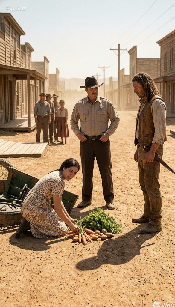 Her hands moved quickly, desperately trying to salvage what remained of her produce before the sheriff decided to confiscate it all or worse. The rough wooden planks of the boardwalk scraped her knees through her worn calico dress, but she ignored the pain. She had learned long ago that showing weakness only invited more cruelty.
