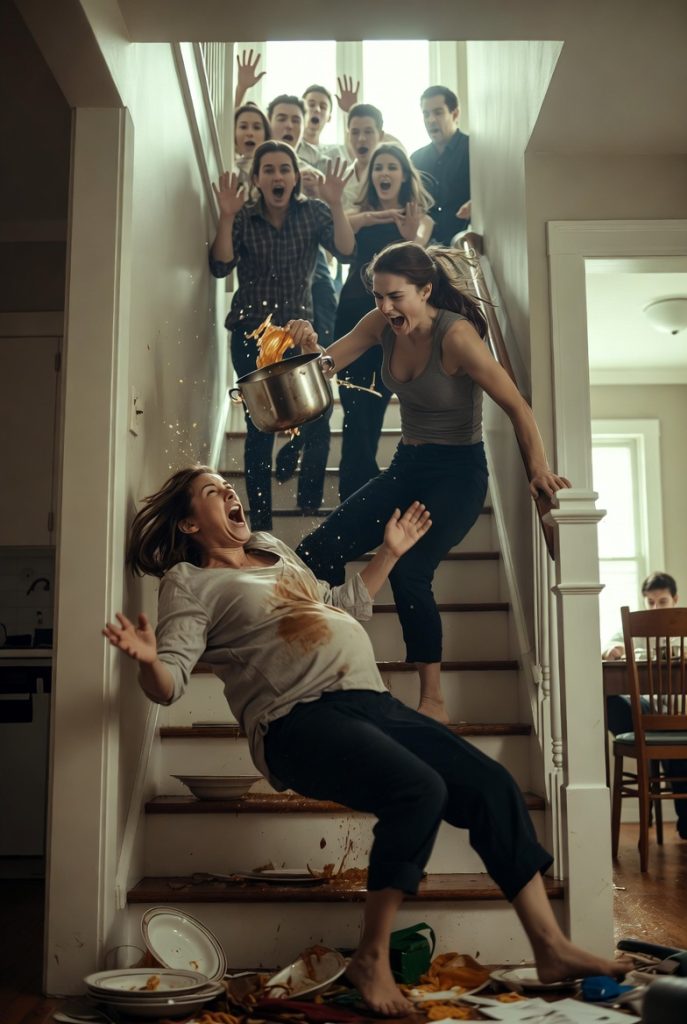 I screamed, stumbling backward as my hands flew up to protect my belly. My feet tangled together. The world tilted sideways. Then I was falling. My shoulder hit the first stair. My hips struck the second, but it was the third step where everything went wrong. The sharp wooden edge caught my pregnant stomach with brutal precision.