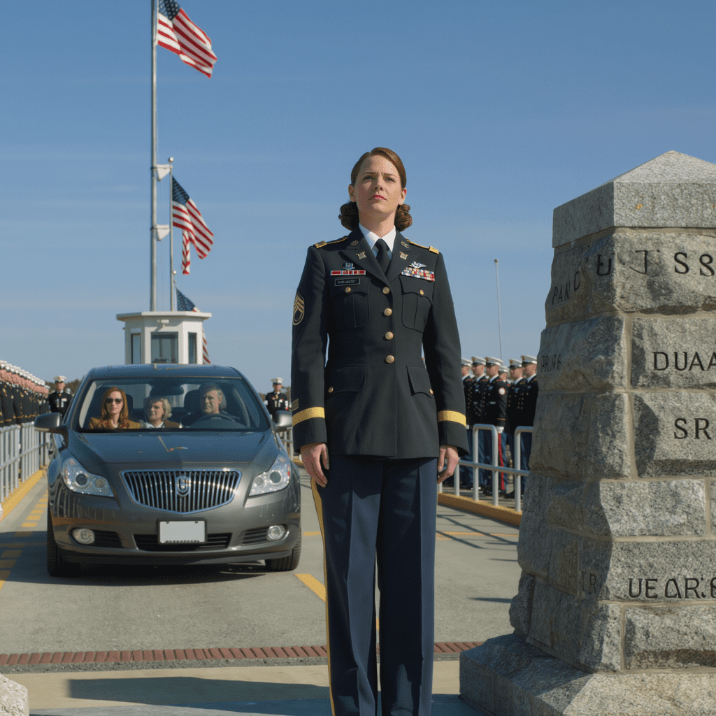 The crowd dispersed on the parade field, sunlight warming the granite letters of Develin Gate. Mara’s family approached, Carla first, arms open for a hug. Philip followed, older, deliberate in step; Savannah hung back, unusually subdued.