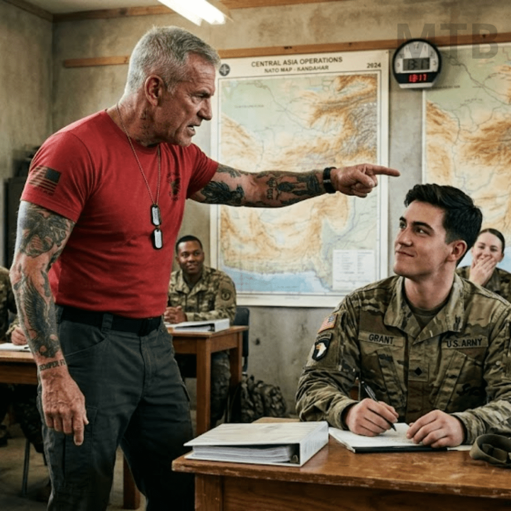 “Attention on deck!” Commander Vance waved a hand. “As you were, sit down.” Vance walked to the front of the room. He didn’t look at the recruits. He looked at Elias. The commander’s face broke into a look of profound respect, bordering on reverence. He extended a hand. “Elias,” Vance said warmly. “I wasn’t sure you’d actually come.” “I said I would, sir,” Elias replied, shaking the hand. Vance turned to the class. He saw the stunned expressions. He saw the tension. He looked at Miller, who was looking at the floor. “I see you’ve met the legend,” Vance said. “Gentlemen, you are looking at the founding father of the tactical survival program you are currently studying. Before we had GPS, before we had thermal drones, we had men like Elias Thorne. He was a member of SEAL Team 6 before half of you were born. He has operated in more countries than you can name. He’s the only man I know who has been awarded the Navy Cross twice.” A collective gasp went through the room. The Navy Cross twice! That put him in the realm of mythology. “I asked him to come here today not to teach you how to shoot,” Vance continued. “You already know how to shoot. I asked him here to teach you how to endure because the technology breaks, the batteries die, the comms go down, and when that happens, all you have left is what is inside your chest and who is standing next to you.” Vance looked at Elias’s arms. “And I see he’s already started the history lesson. Those tattoos are the only map you need to understand what sacrifice looks like.” Vance nodded to Elias and stepped to the side, relinquishing the floor. The hierarchy was clear. In this room, the commander was in charge, but Elias was the master. Elias walked back to the podium.